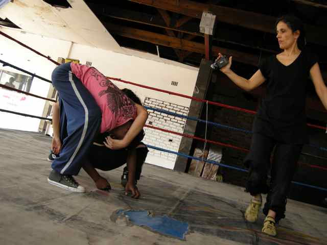 Ce travail recompose des éléments issus d’une résidence effectuée à Johannesburg en 2009, organisée par des collectifs d’artistes menant un travail en lien avec l’environnement urbain, les Scénographies urbaines et Joubert Park Project (JPP). JPP était basé au Drill Hall, dans le secteur de Joubert Park, au centre ville de Johannesburg, ancien quartier blanc de la finance, aujourd’hui habité par des noirs sud-africains et des immigrés de tout le continent, la plupart squattant ou vivant dans la rue. Il s’agissait de vivre et travailler dans ce quartier durant la résidence, et de restituer le travail dans l’espace urbain. Les tensions et les violences du quartier ne permettant pas de sortir une caméra ou un appareil photo, j’ai choisi de travailler notamment dans un gym de boxe, avec un ring installé à la place d’une station essence, séparée par une grille de la rue, constituant une véritable scène urbaine. Ce lieu me paraissait aussi emblématique des combats des personnes du quartier et des luttes à l’échelle du pays, s’y entrainaient des femmes et des hommes, des champions et des débutants, y vivaient des personnages improbables comme un poète congolais, un ancien combattant de la lutte anti-apartheid…