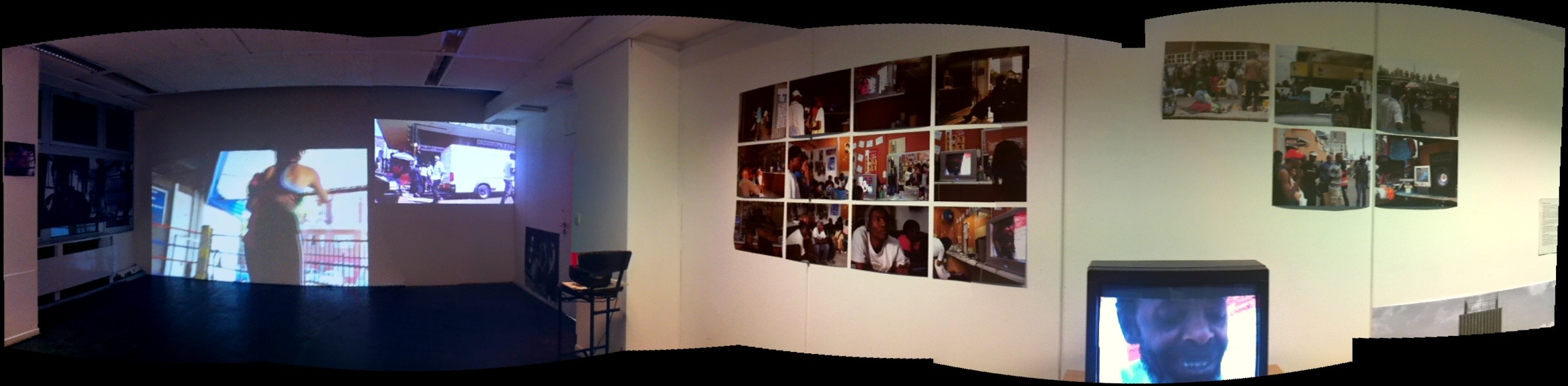 La projection de la vidéo d’une performance, Battle of love sous forme de combats dansés avec un couple, un danseur de Soweto et une jeune femme belge formée au ballet contemporain, étant moi-même arbitre à la caméra. Je m’expose en même temps que les personnes que je filme, en étant dedans et dehors à la fois, dans la rue et pas dans la rue, dans ce combat et pas dedans…